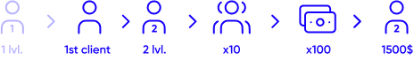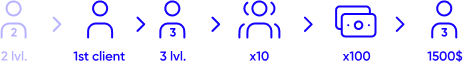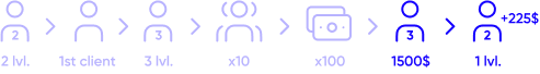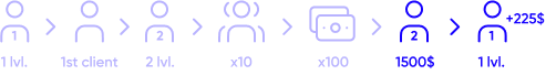 उनका पहला ग्राहक एक पार्टनर (स्तर 2) बन जाता है और 10 और ग्राहकों को रेफर करता है। ये ग्राहकों एक साथ 100 लॉट लगाते हैं। पार्टनर रिवॉर्ड प्रोग्राम की शर्तों के अधीन स्तर 2 पार्टनर को 15$ प्रति लॉट मिलेगा।